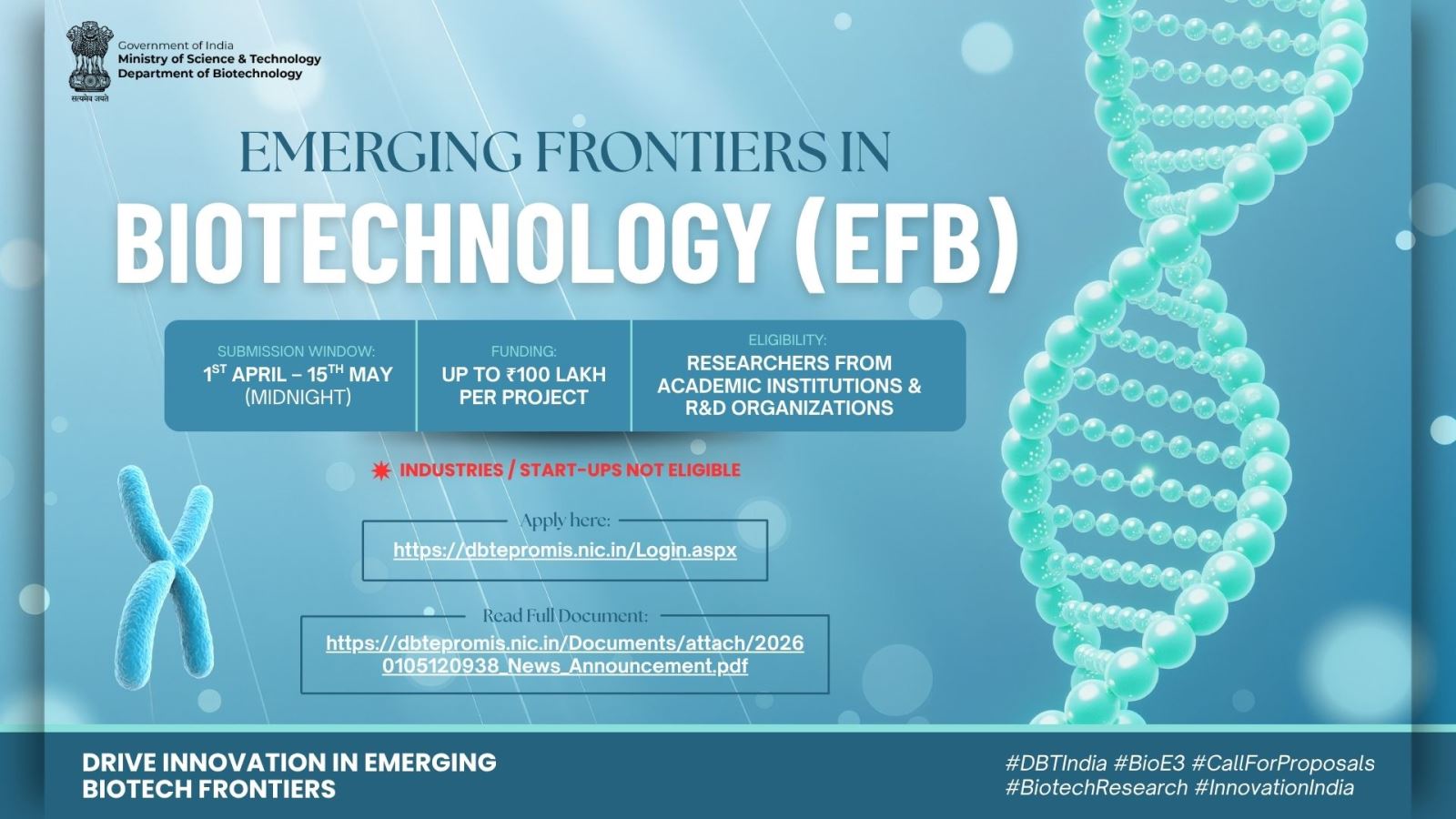 Call for Submission of Project Proposals under DBT – Emerging Frontiers in Biotechnology (EFB) |