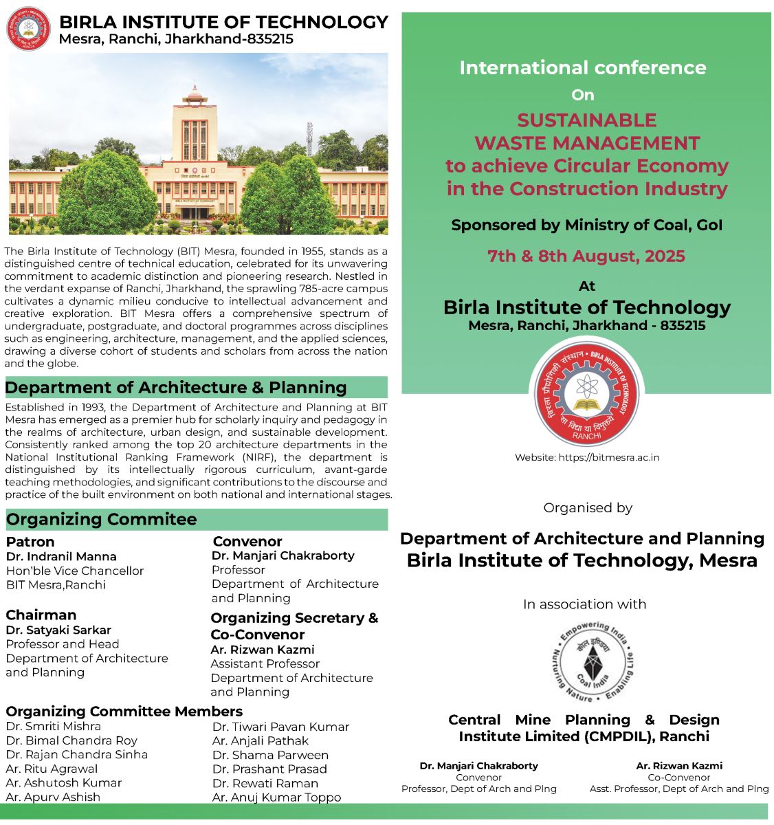 The Department of Architecture and Planning, Birla Institute of Technology, Mesra, Ranchi is pleased to announce the 1st International Conference on Sustainable Waste Management to Achieve Circular Economy in the Construction Industry (ICSWM-2025).