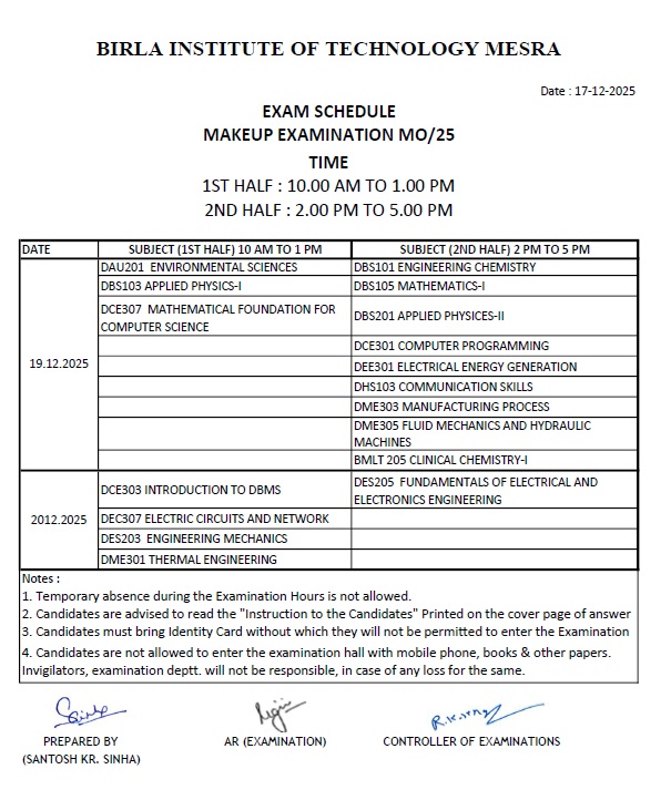 MO-25 MAKEUP EXAMINATION SCHEDULE