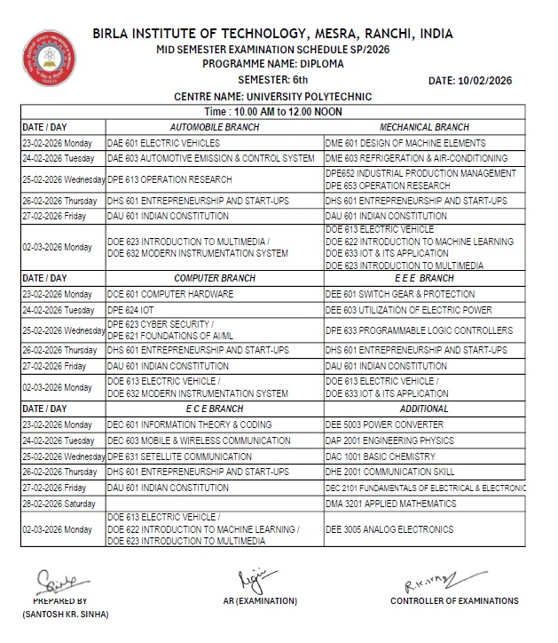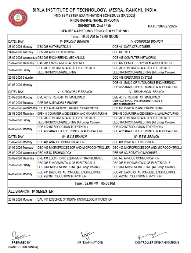 SP/2026 MID SEMESTER EXAMINATION SCHEDULE