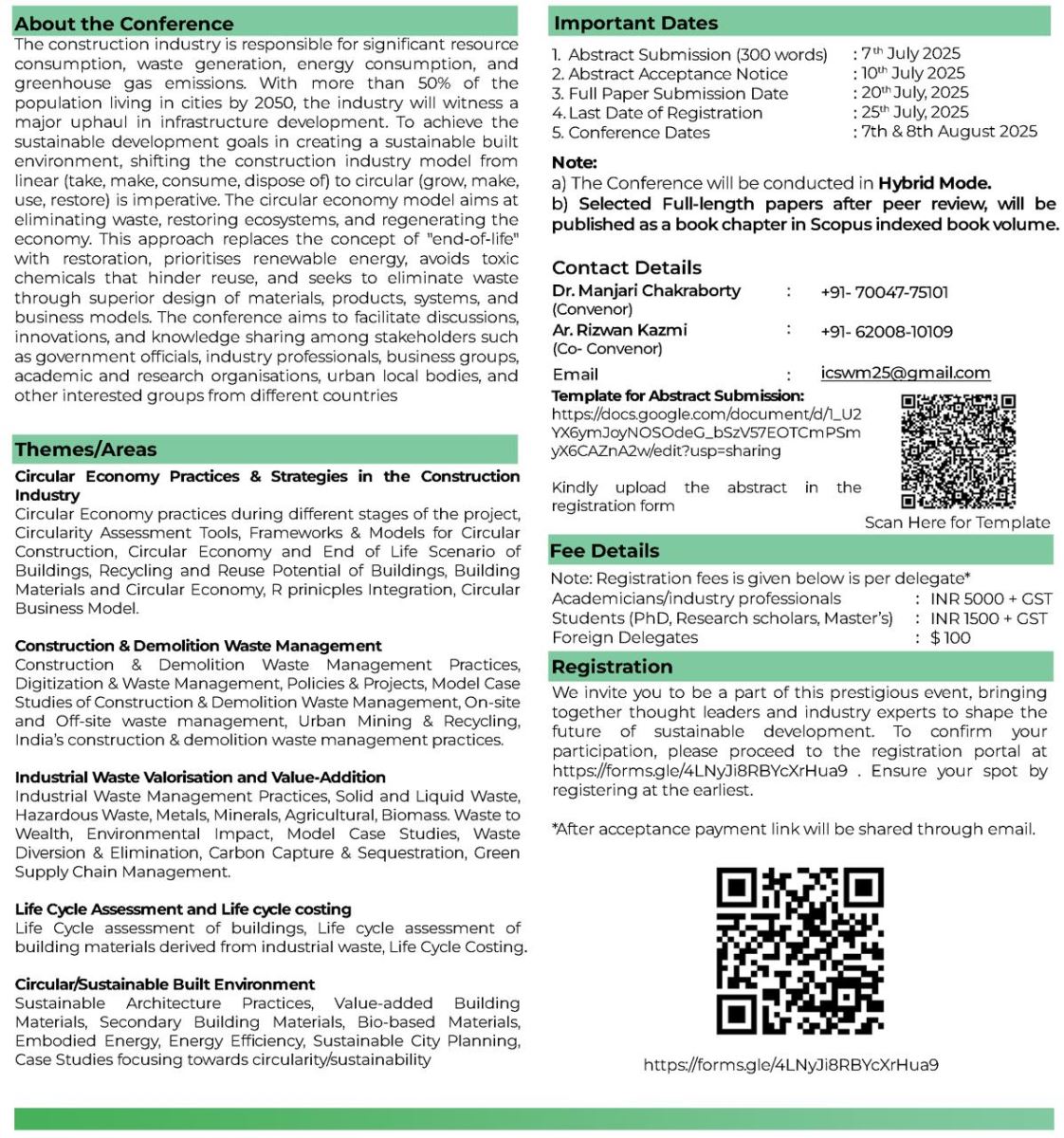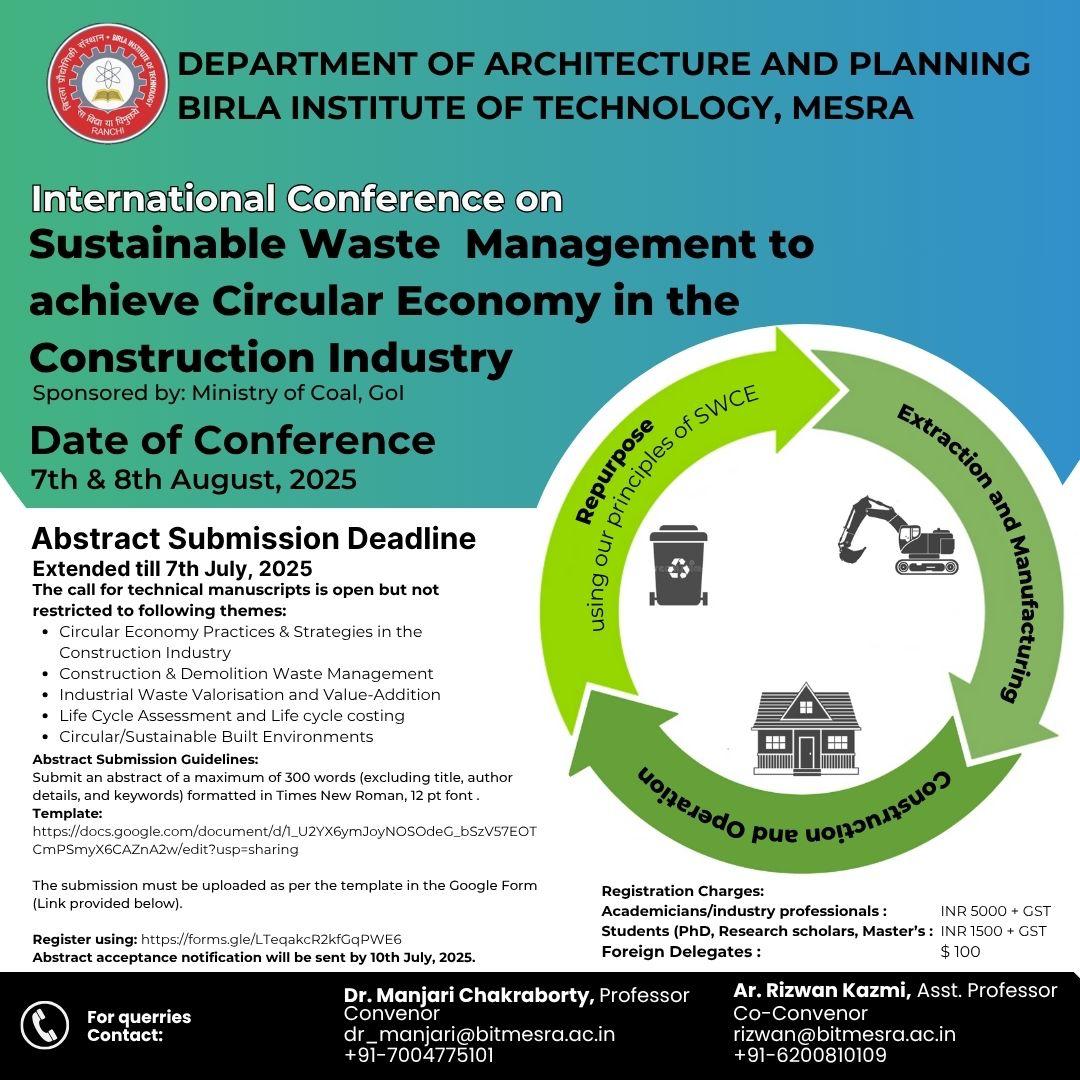 The Department of Architecture and Planning, Birla Institute of Technology, Mesra, Ranchi is organising the International Conference on Sustainable Waste Management to Achieve Circular Economy in the Construction Industry (ICSWM-2025), in collaboration with CMPDIL, Ranchi, funded by the Ministry of Coal, GoI.
