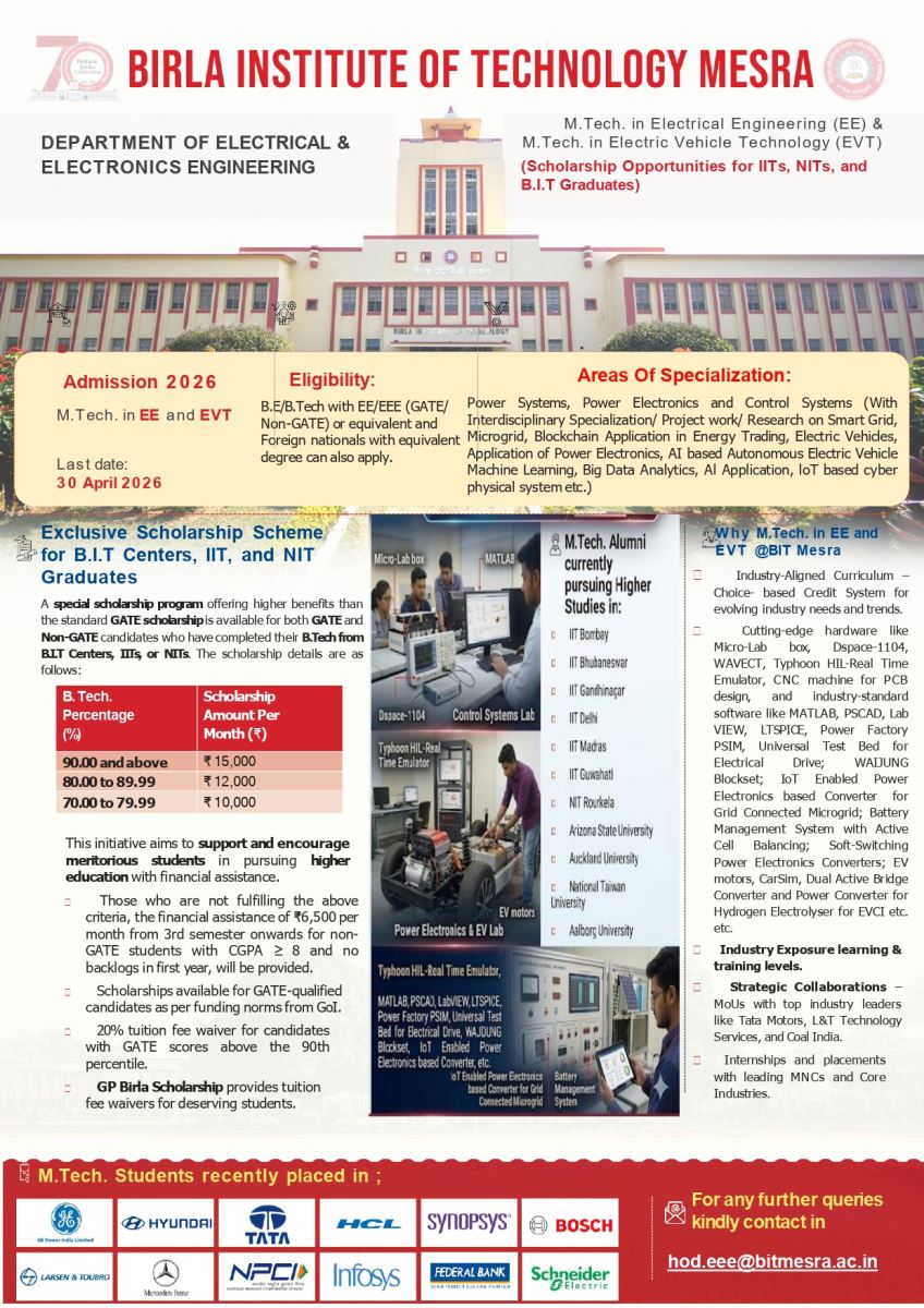 The department has signed an MoU with L and T Technology Services and CCL to foster the research works based on industrial problems. Department has also renewed the existing MoU with Tata Motors Ltd. for conducting M.Tech in EV Technology and skill development program for their professionals. Department has initiated the Laboratory set-up for Electric Vehicle and Battery Management.