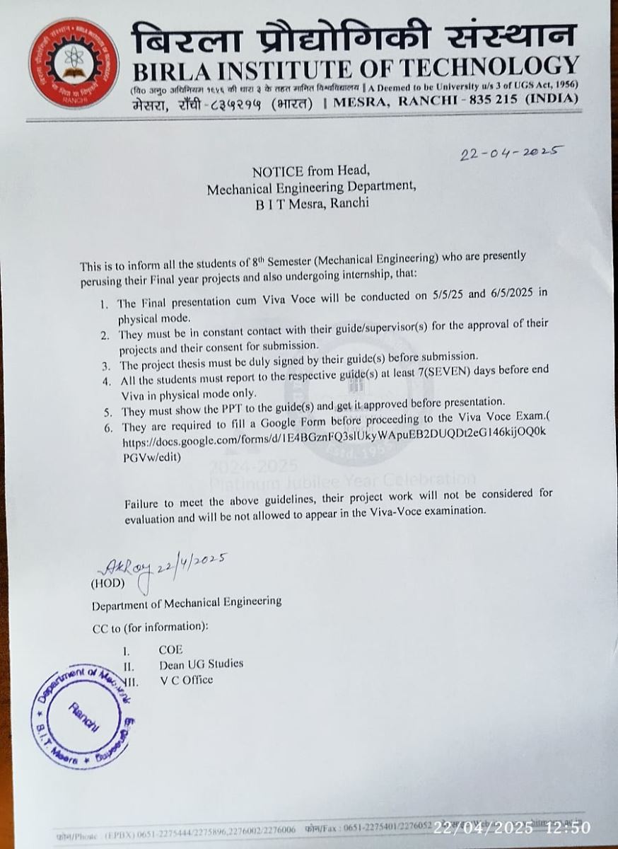 2. Notice for 8th Semester (Mechanical Engineering) who are presently persuing their Final year  projects and also undergoing internship.(For Open Notice , please click here to open the link)