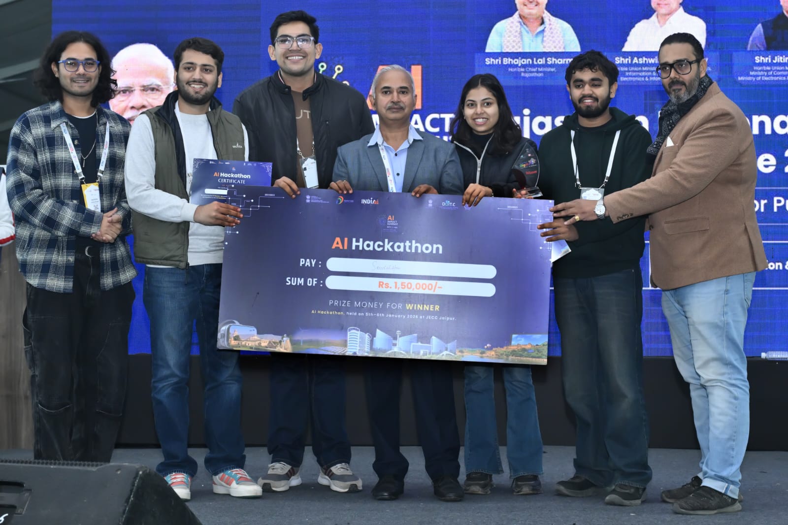 The winning team was awarded a cash prize of ₹1,50,000 (One Lakh Fifty Thousand Rupees) for developing an AI-enabled, geo-verified mobile solution designed for real-time field surveys and intelligent anomaly detection—a solution with strong potential for use in governance, infrastructure monitoring, and public service delivery.