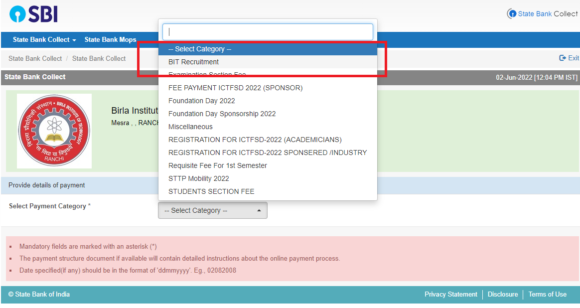 FOR FEE PAYMENT, KINDLY USE “BIT RECRUITMENT” drop down option in the SBI Collect Portal. Do not use any other option from the drop down menu else the application will not be accepted.