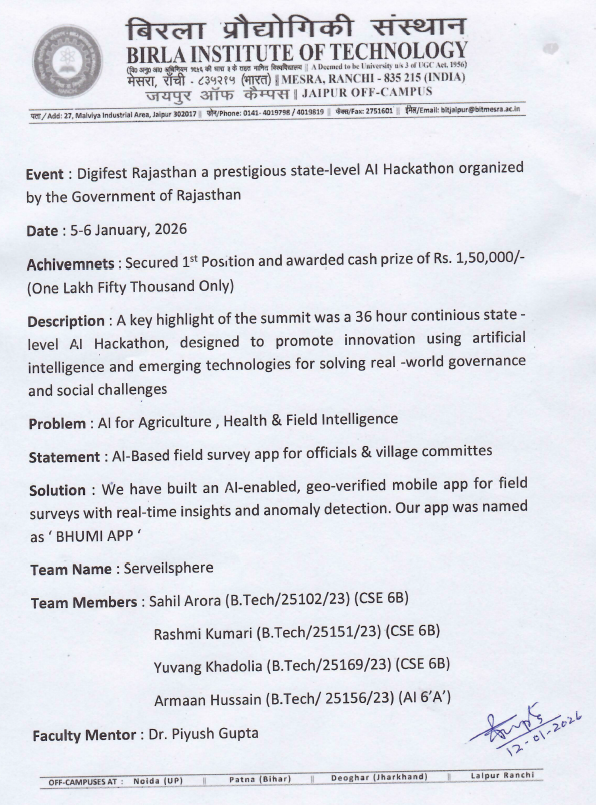 Students from Department of Computer Science has obtained the first Rank in the Digifest AI Hackthon 2026