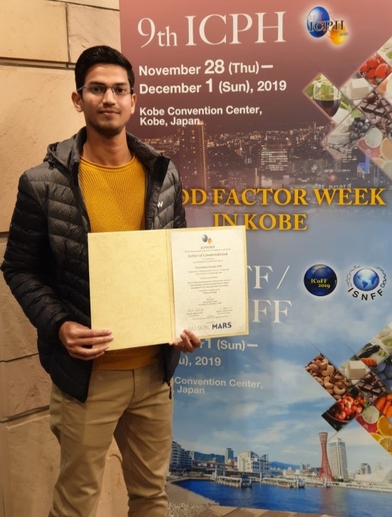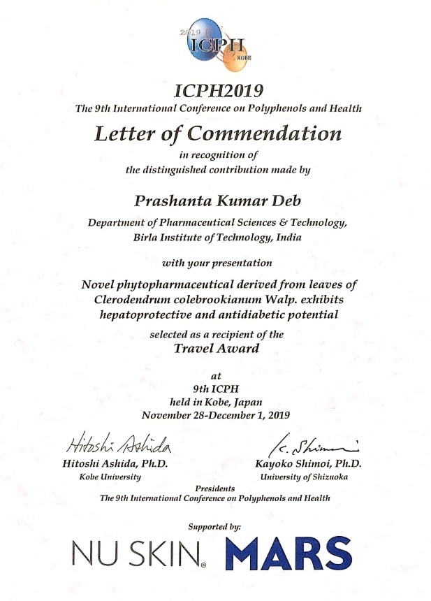 Prashanta Kumar Deb, Ph.D. scholar and ICMR-SRF in Department of Pharmaceutical Sciences & Technology received Travel Award from Polyphenol Society of Japan during “The 9th International Conference on Polyphenols & Health (ICPH2019)” held in Kobe, Japan, November 28- December 01, 2019.