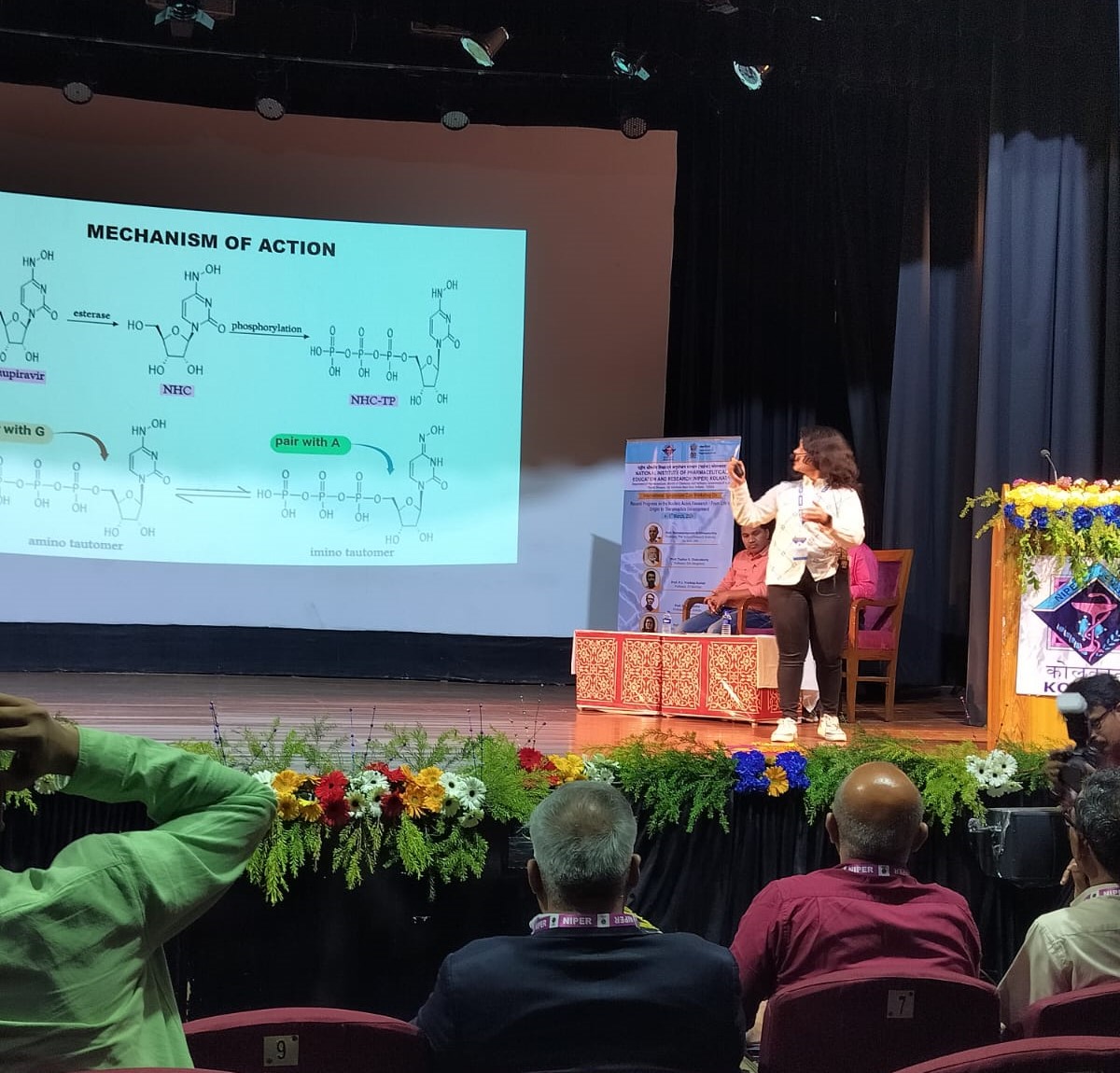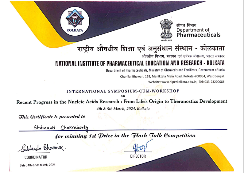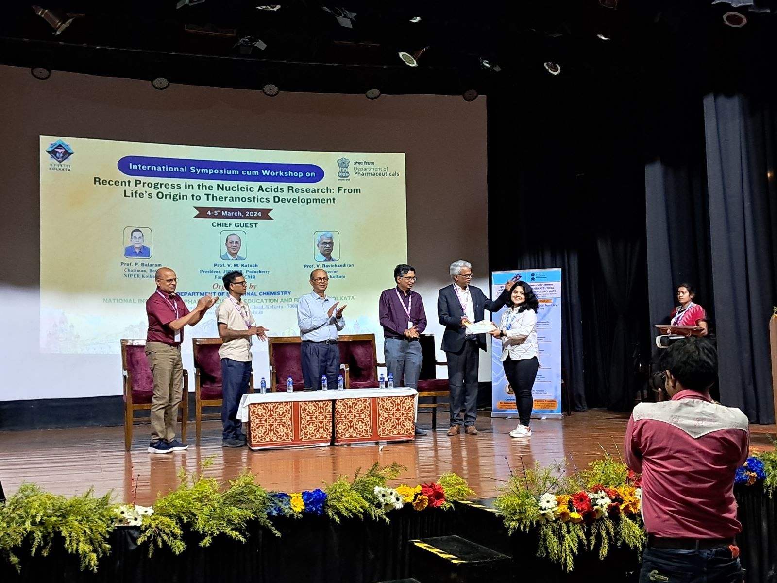 Ms. Shrimanti Chakraborty (MPH/10037/23), M. Pharm. (Pharmaceutical Chemistry) first year student of the Department of Pharmaceutical Sciences and Technology received the First Prize in Flash Talk Competition along with a money prize of Rs.10,000/- in the International Symposium cum Workshop on "Recent Progress in the Nucleic Acids Research: From Life's Origin to Tharranostics Development", organized by NIPER Kolkata, held at Rabindratirtha Auditorium, Newtown, Kolkata, India from 4th – 5th March, 2024.