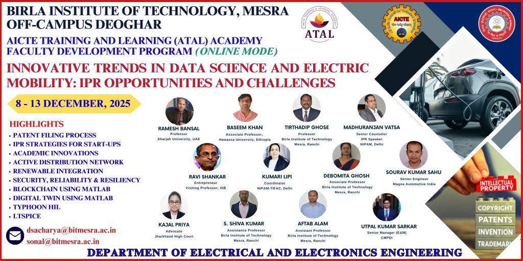 The Department of Electrical and Electronics Engineering, B.I.T. Mesra, Off-Campus Deoghar organized a six-day ATAL Online FDP on Innovative Trends in Data Science and Electric Mobility: IPR Opportunities and Challenges from 08th December 2025 to 13th December 2025. The Coordinator of the FDP was Dr. Deep Shekhar Acharya, Assistant Professor and In-Charge of the department. The Co-Coordinator of the FDP was Dr. Sonal, Assistant Professor in the department. The FDp was attended by 199 participants hailing from different states of the nation. The program concluded successfully with wide participation from academia, research, and industry, fulfilling its objectives of capacity building and innovation-driven learning. It featured a well-balanced mix of advanced technical sessions on electric mobility, smart grids, renewable energy, AI/ML, and emerging domains, complemented by industry-focused talks on EV testing and HIL simulation. Sessions on IPR, patents, and research commercialization enriched participants’ understanding, and the organizers acknowledged the valuable contributions of resource persons and the active engagement of participants.