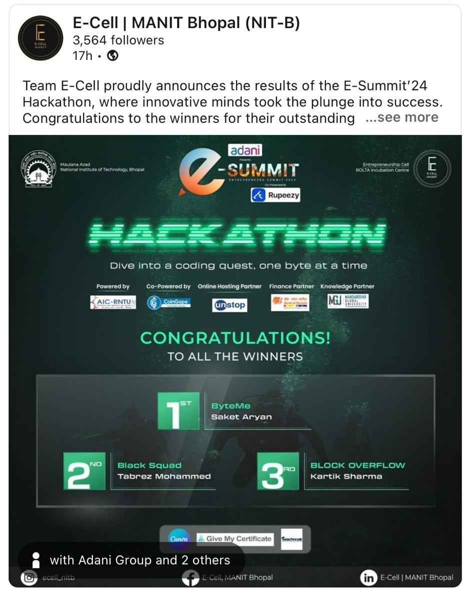 Kartik Sharma CSE 6th sem along with his two team mates Dhruv and Utkarsh won 3rd prize with cash Rs. 10,000/- in the central India largest E Summit-24 Hackathon , conducted by M.A.N.I.T. Bhopal.